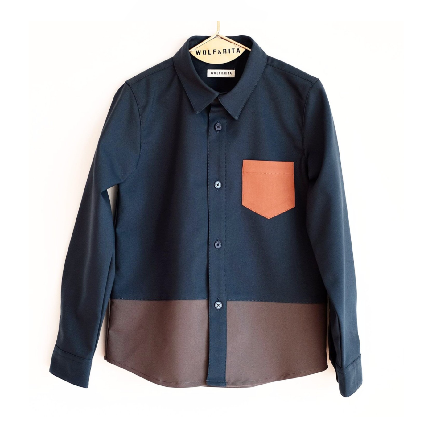 A rad and unique long sleeve, collared shirt featuring a color blocked base and pocket.