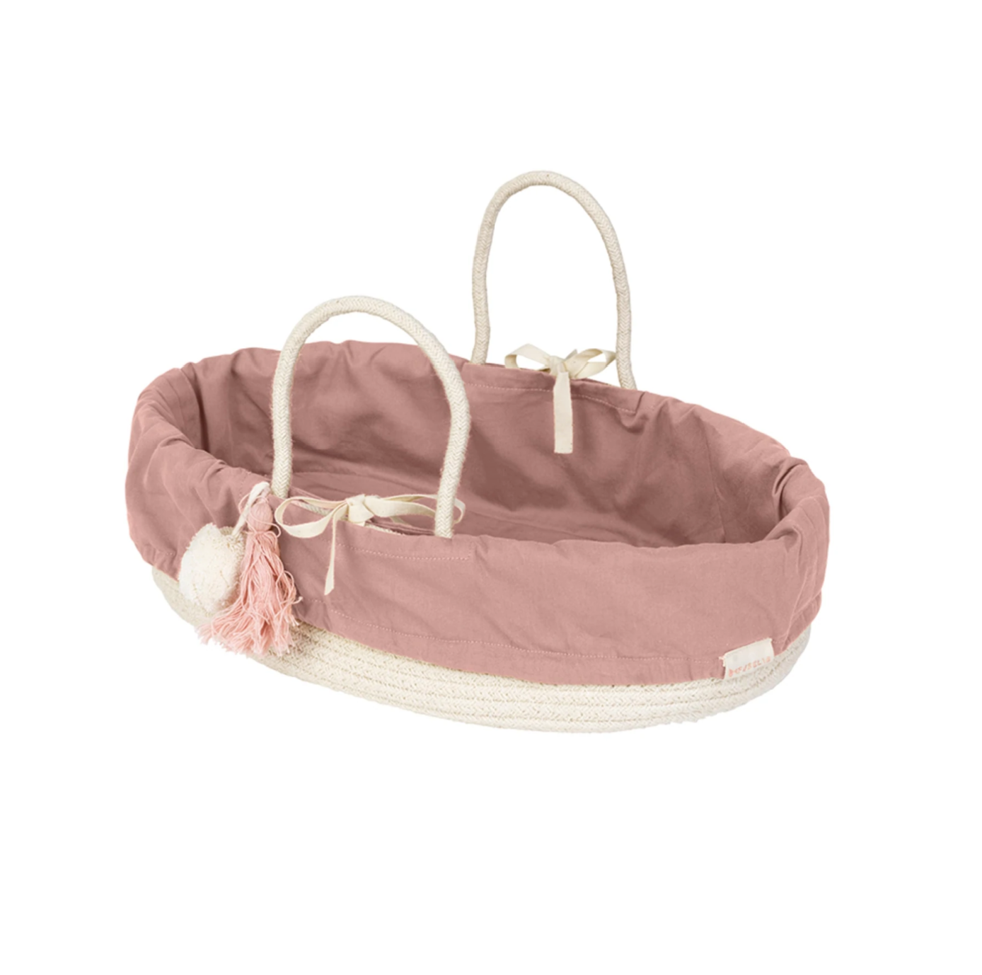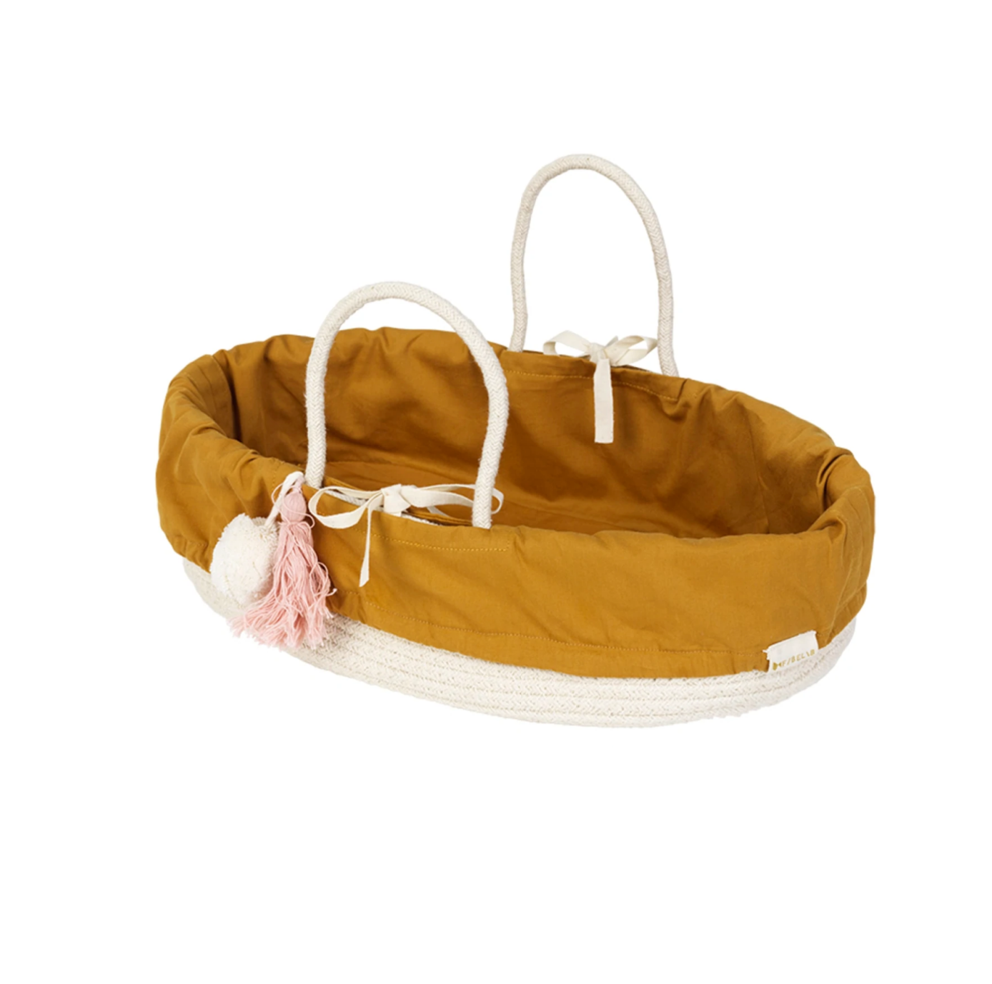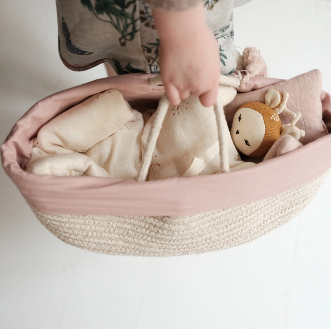 A versatile basket that can be used as a doll bed or storage. Each of these soft baskets is woven from natural cotton rope and fitted with a removable, ochre-hued lining. The basket has extra-long handles, bow-tie closures on the lining, and a pink tassel and white pom pom for added flair.