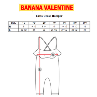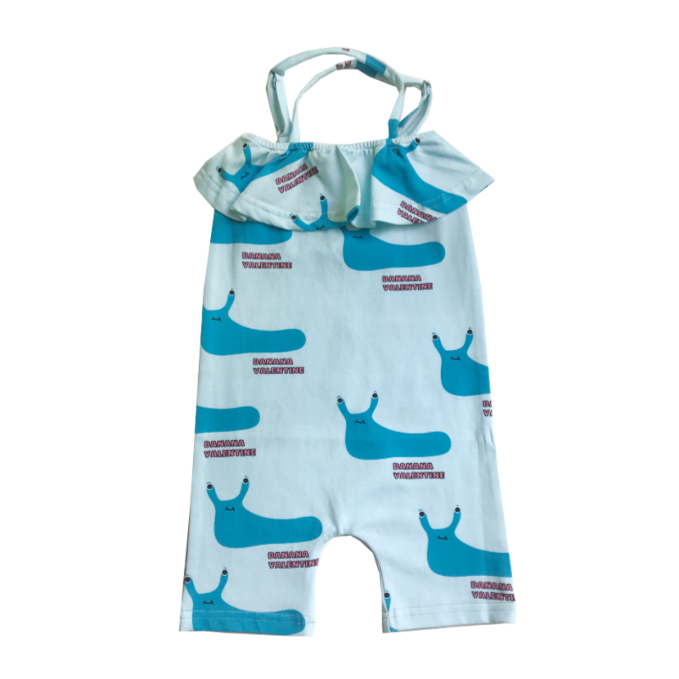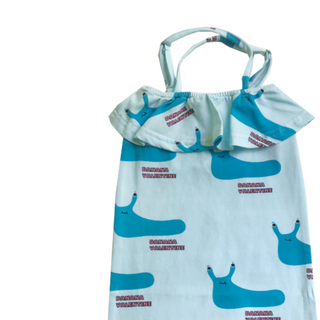 An adorable criss cross romper featuring an all over blue slug print and front ruffle. Perfect for your bug loving little one. Pair with one of our hair clips and sandals for the perfect outfit!