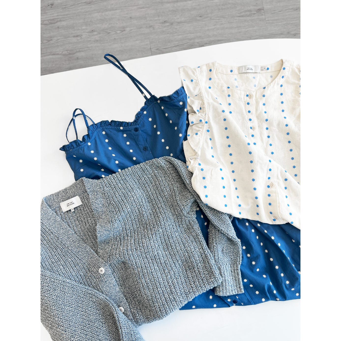 The Sofia cardigan is made with recycled cotton melange. It features a V-neck with button-front opening and Fisherman's rib stitch detail, with ribbed cuffs and hem. The perfect cover up for all seasons in a dark washed blue grey.
