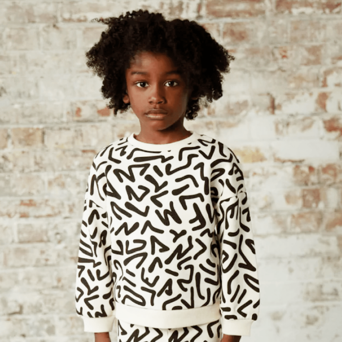 This rad sweatshirt features an all over black and white print on a brushed back french terry, has a raglan sleeve and is designed to last wash after wash. We recommend sizing up for a looser fit.