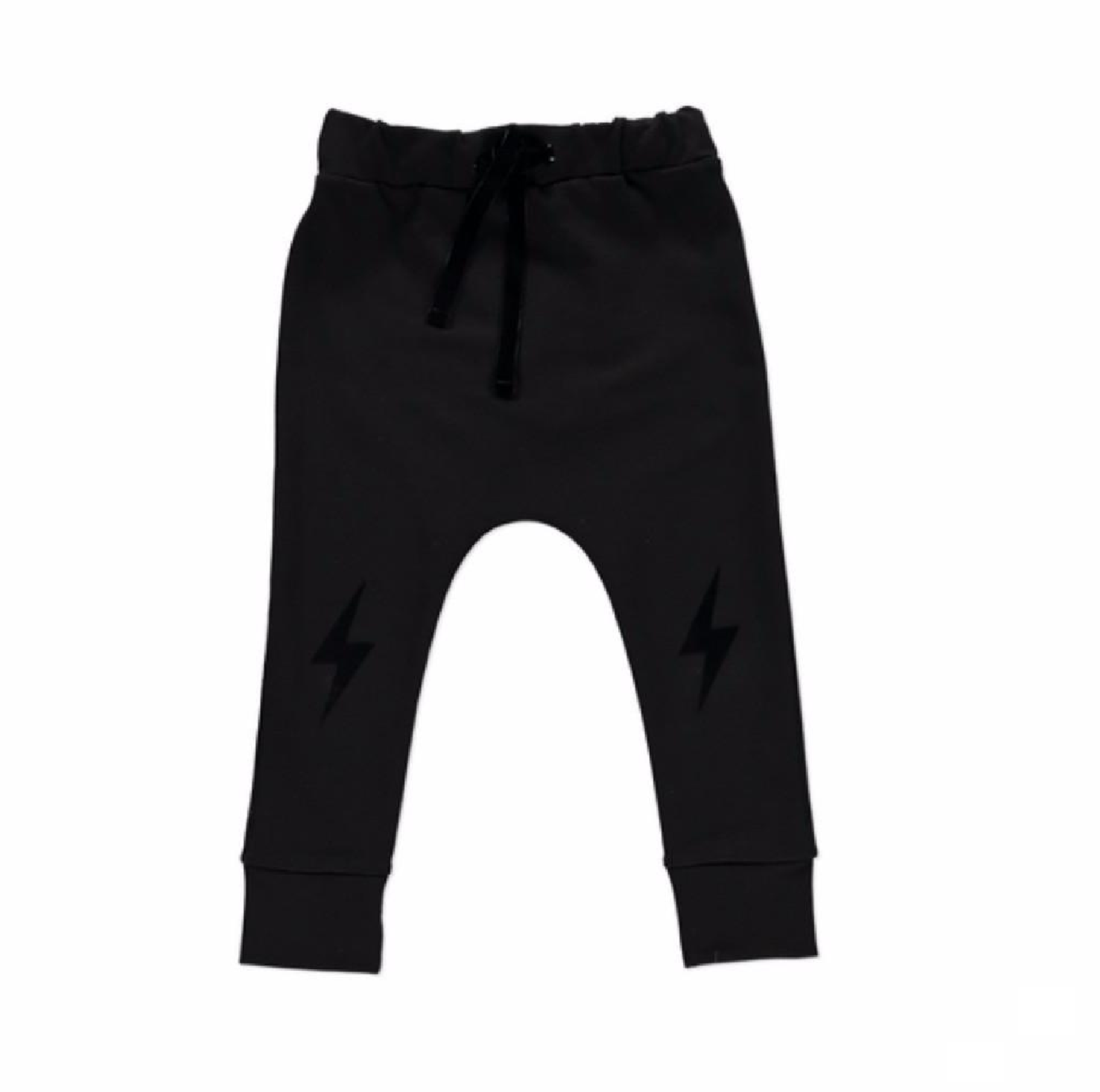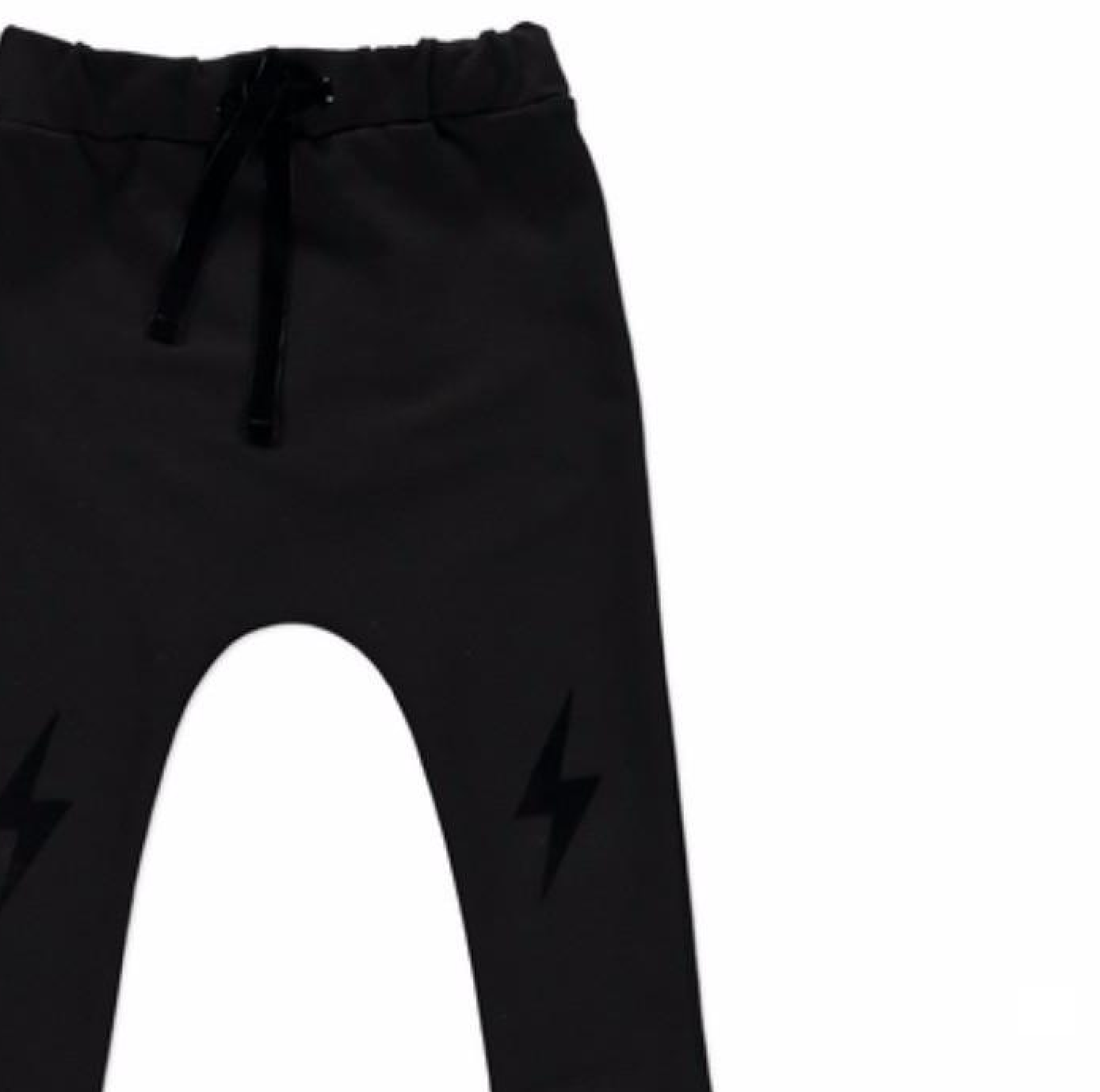 Cozy black sweatpants with subtle black-on-black lightning bolts on the knees and a velvet drawstring.