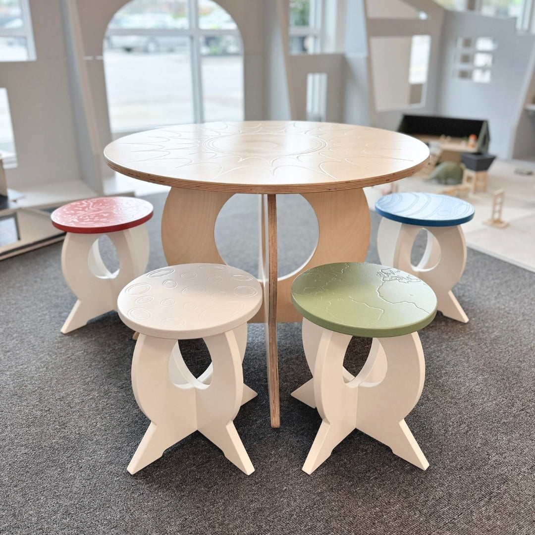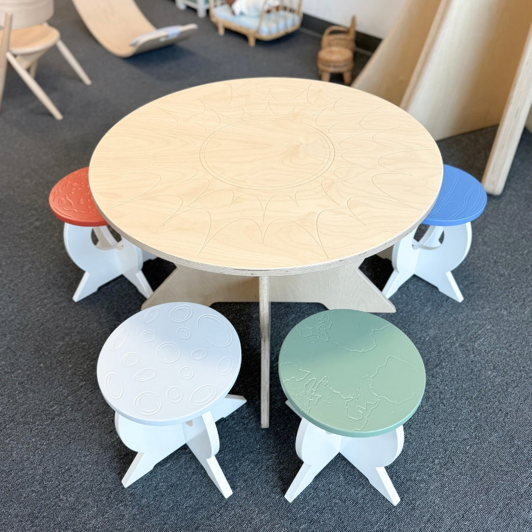 Built with safety in mind, the rocket stool is crafted from high quality wood materials, ensuring durability and reliability. Its compact size makes it ideal for little explorers, providing a comfortable and secure seat.Built with safety in mind, the Sun Table is crafted from high quality