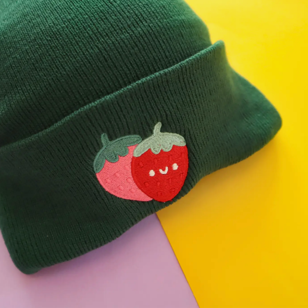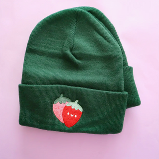 When you love all things kawaii and want to rock it all the time, this beanie is for you. Designed to fit kids and adults! Featuring a deep green knit with a unique strawberry embroidery. Designed by USA based illustrator, Vica.
