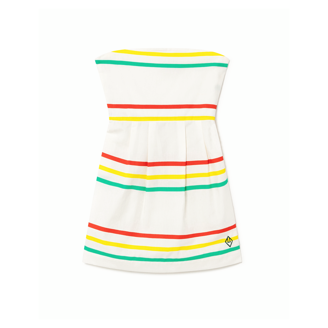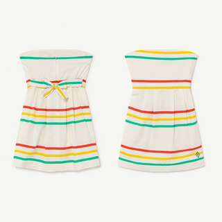 A gorgeous strapless dress featuring an all over striped print, zip back and tie. Includes a delicate boning structure to help keep your dress in place. Layer it with your favorite tees and tanks or rock all on it's own.