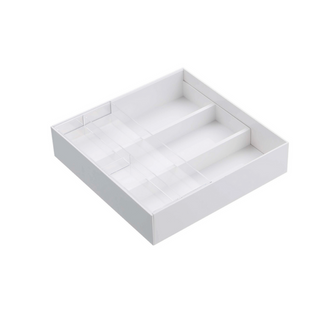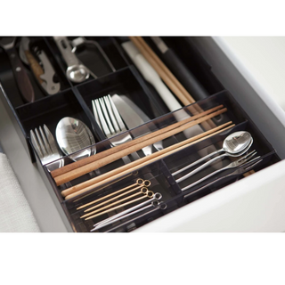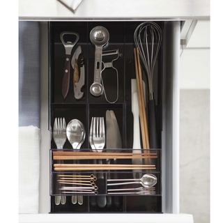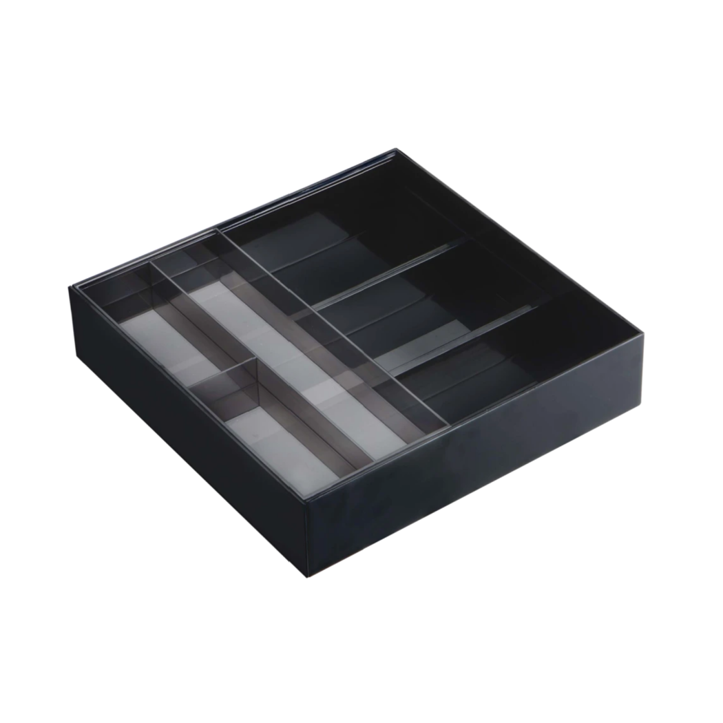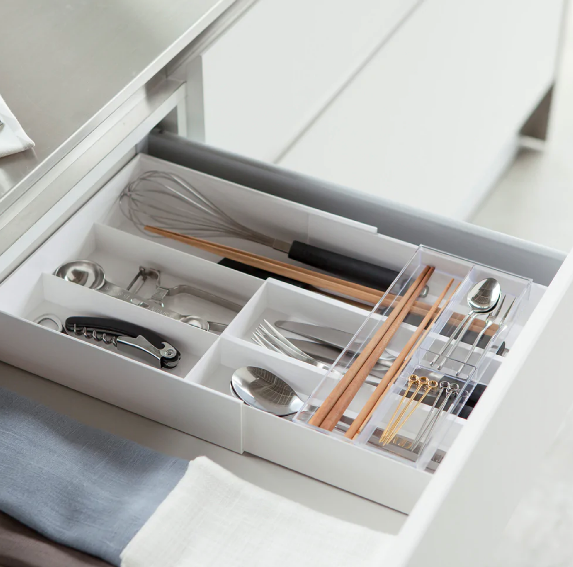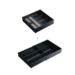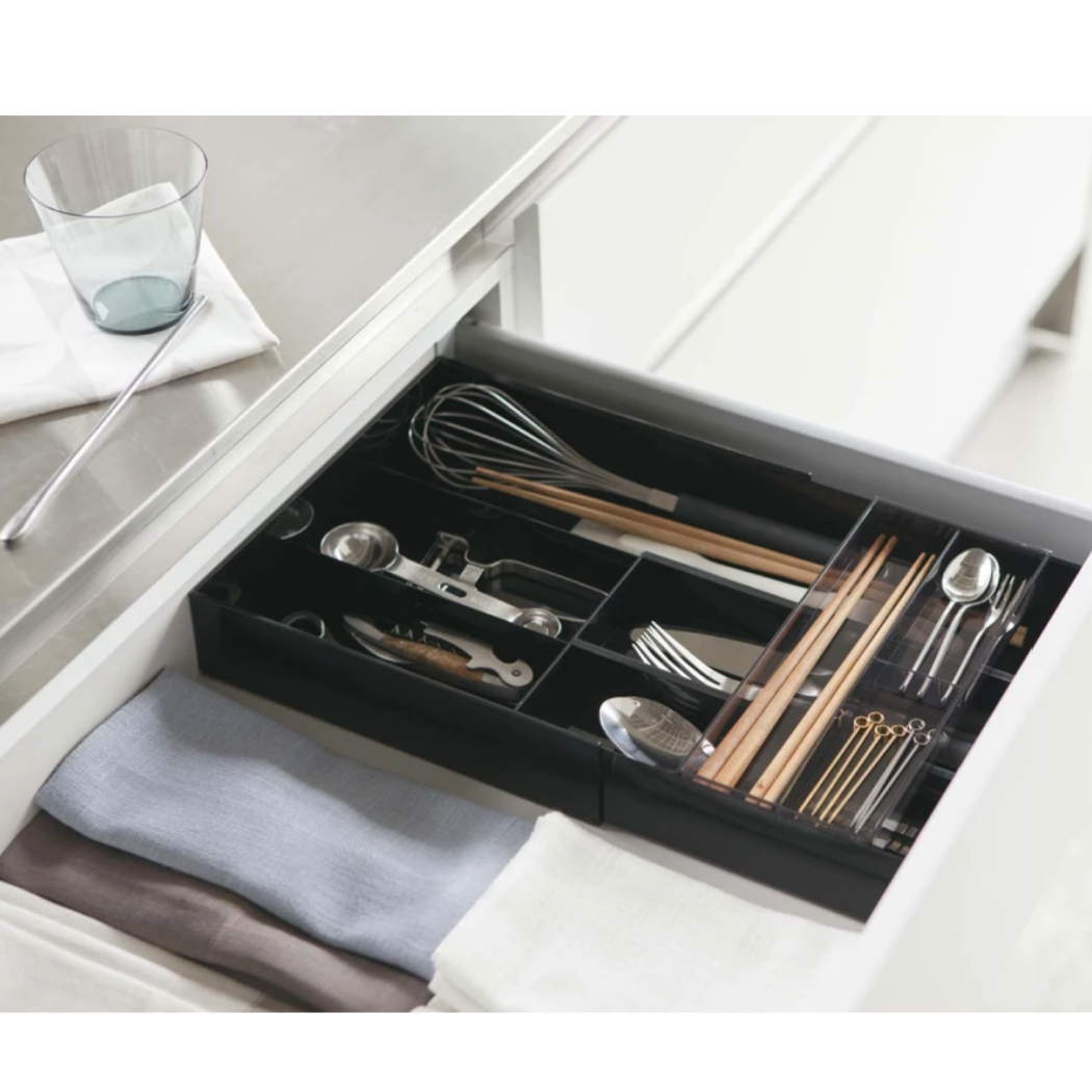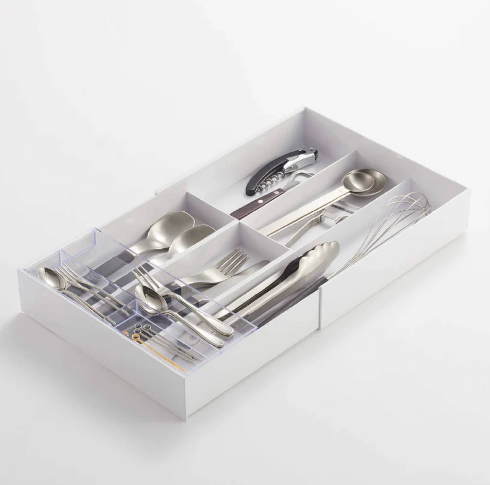 This cutlery tray expands vertically to accommodate various sized drawers. Includes a nested tray for smaller items that slides along the top, leaving easy access to utensils below.