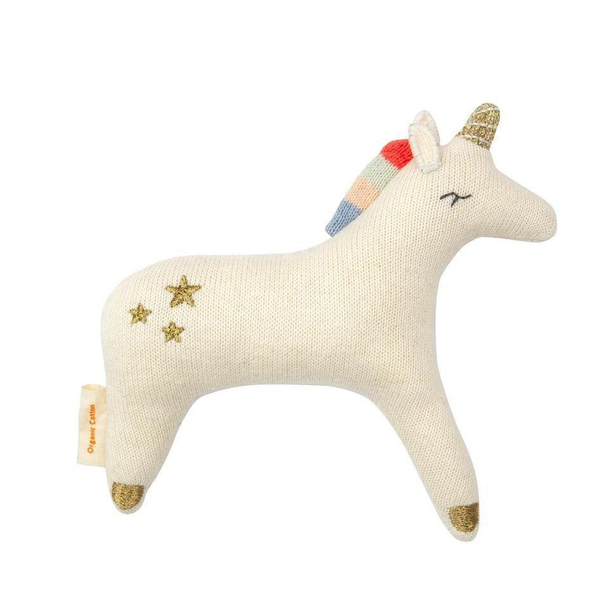 This adorable unicorn rattle is a magical gift for a little one. Beautifully crafted from soft organic knitted cotton with a sweet embroidered features and golden stars.