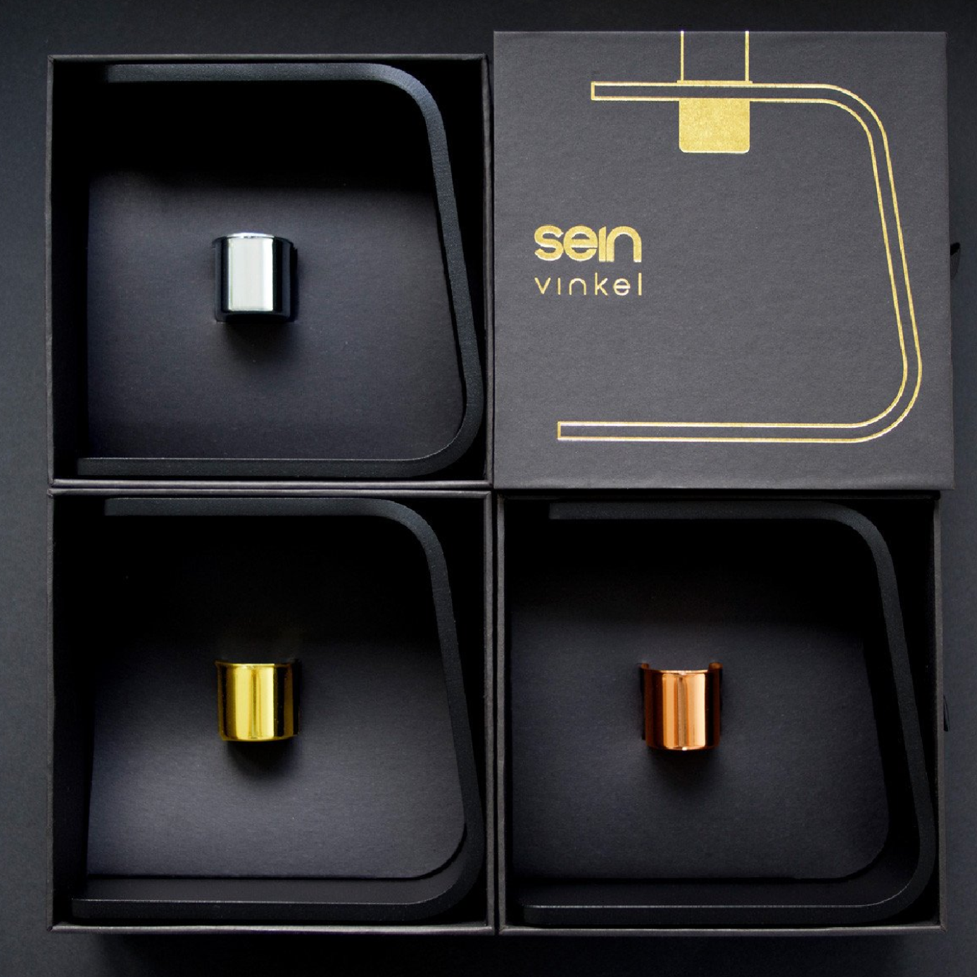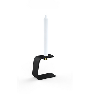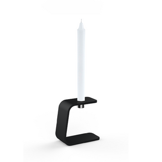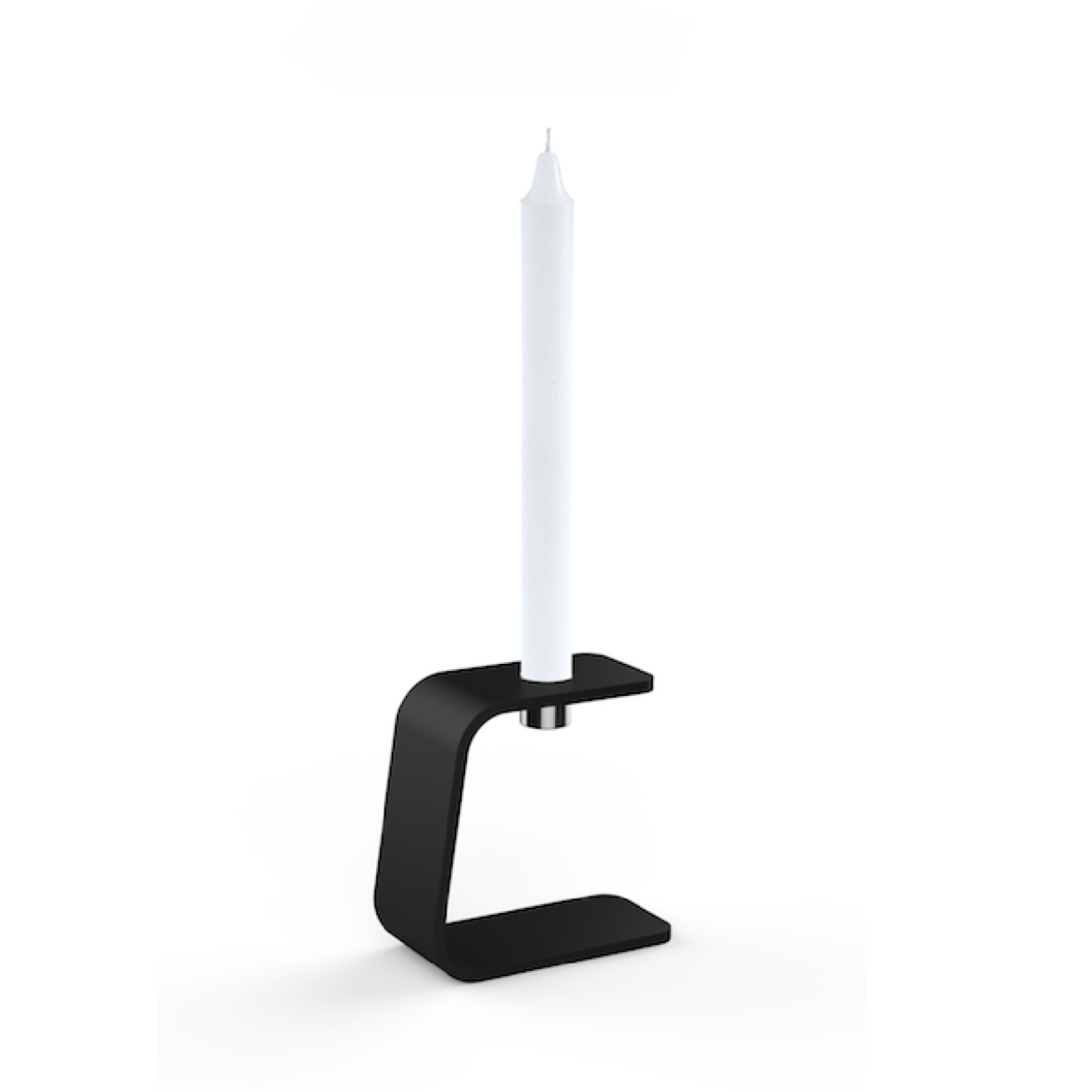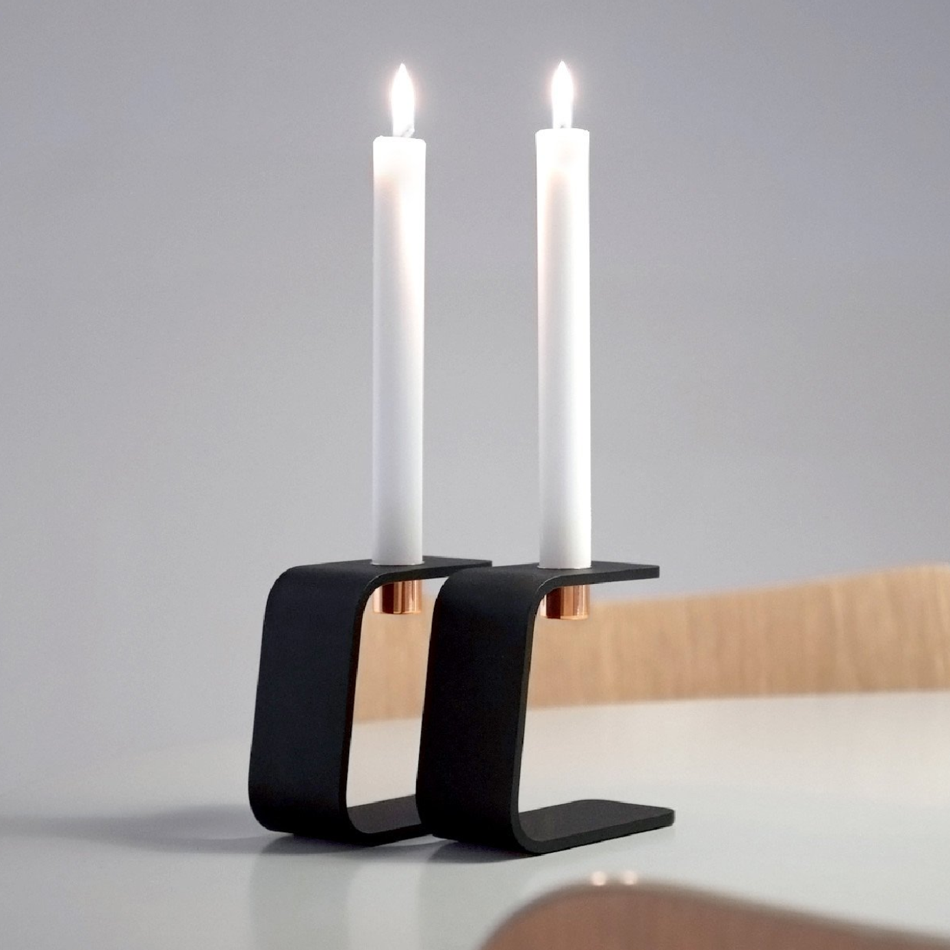 Made of a laser cut piece of iron, bend and powder coated in a carefully selected matte black texture. The cup holding the candle is plated in either a chrome, brass or copper finish and is packaged in an exclusive custom made box.
