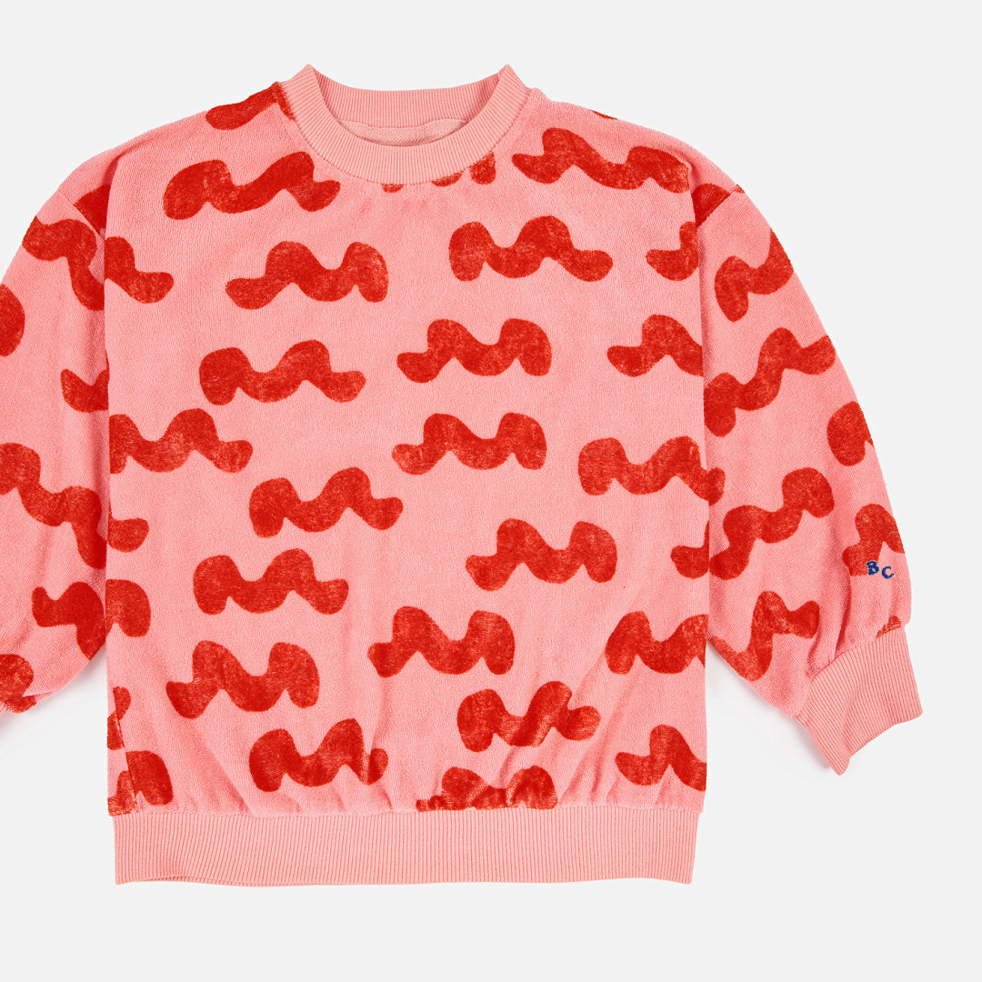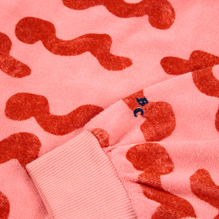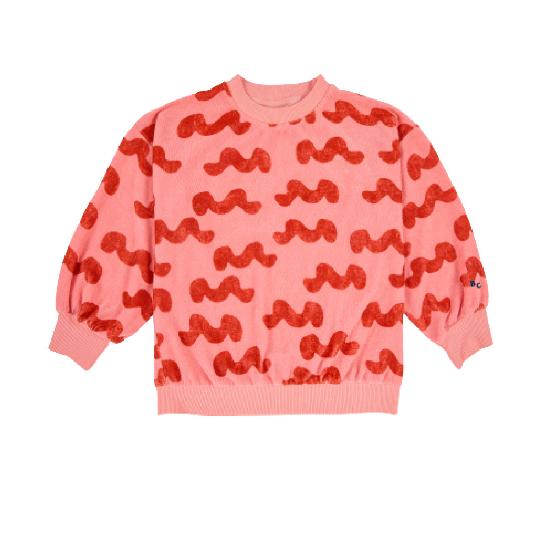 This gorgeous terry sweatshirt features a red wave print on a light pink base. Designed for boys and girls alike.