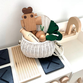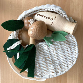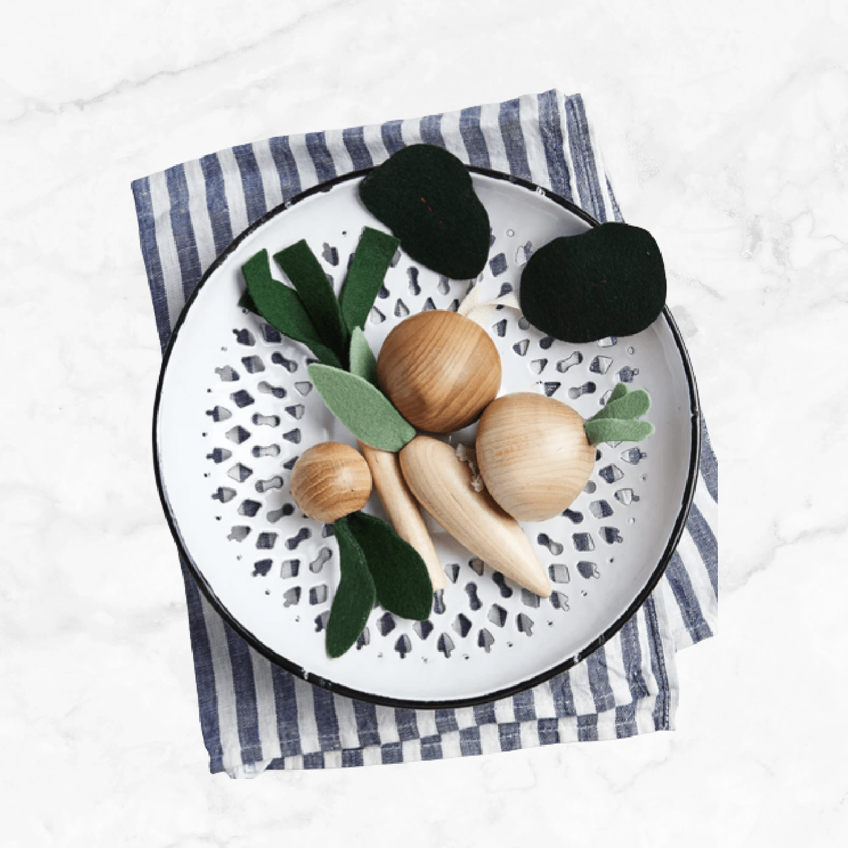 Farm fresh and ready for play, our Veggies Set is the perfect haul from your local farmer's market. Featuring a variety of woods and 100% felt leaves and cotton stems, these vegetables are a colorful addition to your play food collection. Each set includes an Organic Carrot, Local Beet, Onion Bulb, Heirloom Radish, and Leek, and comes in a beautiful cotton drawstring bag.